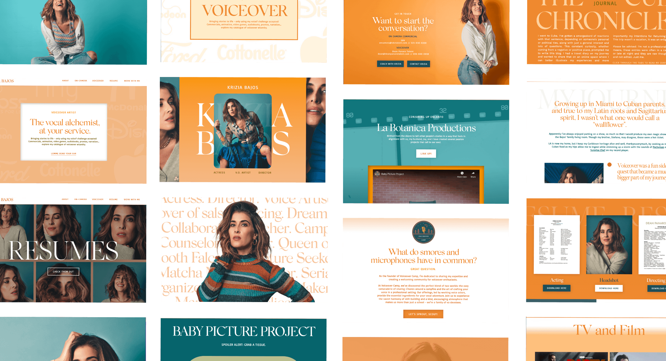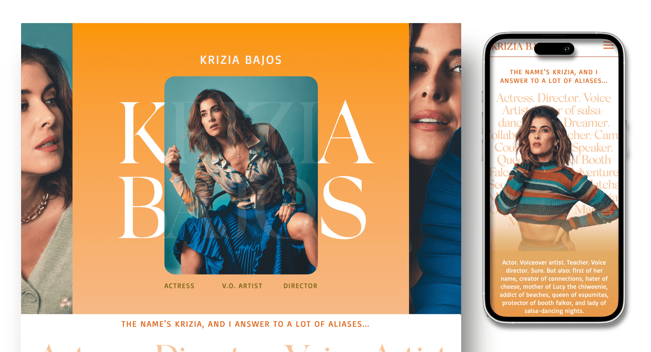 Krizia Bajos is an actress, voiceover artist, director, and the founder of the wildly successful Voiceover Camp, so yeah, her website had some heavy lifting to do. She came to me with a DIY template she'd outgrown and a clear vision: less stuffy industry portfolio, more this is exactly who I am. We built her a full custom site on Showit that weaves together her on-camera work, voiceover catalogue, and resume into one cohesive experience, with TV clips, a scrolling news ticker of featured credits, and a design that lets her personality break through the page without overshadowing the seriously impressive body of work behind it.