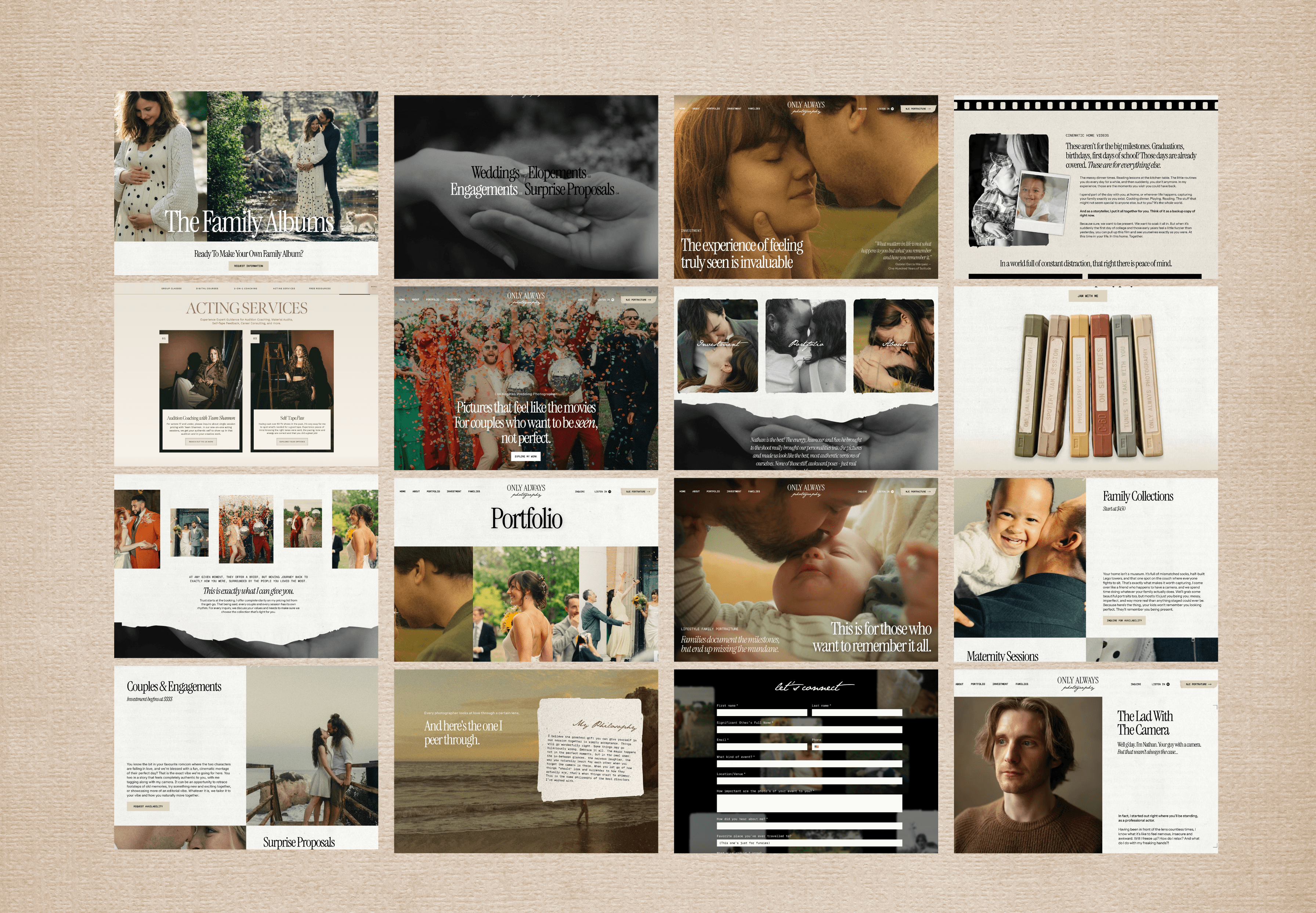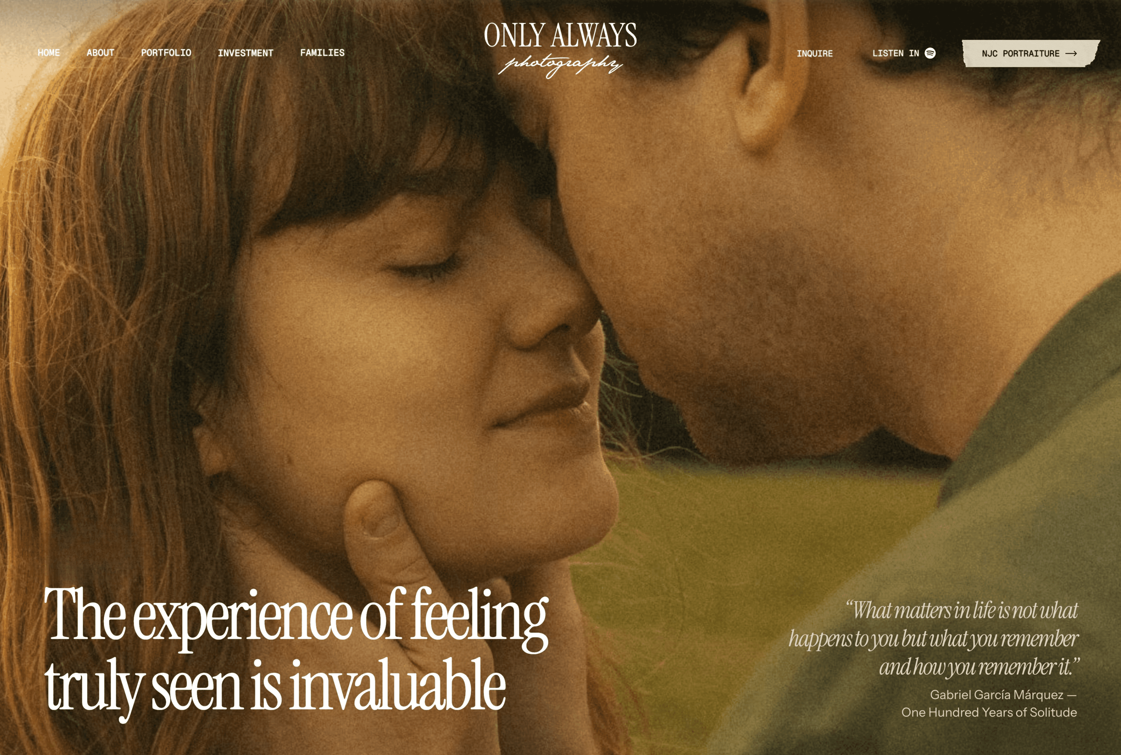 Nathan is a Los Angeles-based cinematic documentary wedding photographer with a point of view that's impossible to mistake: pictures that feel like the movies, for couples who want to be seen, not perfect. Built from scratch on Wix Studio with full brand strategy and identity, the site needed to do justice to work that is genuinely stunning. Warm, filmic, and tactile, with a torn-paper aesthetic running through it that gives everything an intimate, handmade quality, it's the kind of site you linger on. Expansive galleries covering weddings, elopements, engagements, and surprise proposals sit alongside a thoughtful inquiry experience designed to attract exactly the right couples. And then there's NJC Portraiture, a completely separate editorial and headshot brand built into the same ecosystem but with its own distinct identity and vibe. Two brands, one build, zero confusion. He called it sensational. Honestly, hard to argue.